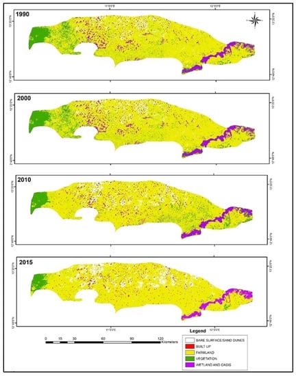 The largest conversion of land cover within the 25-year study period was from vegetated land to farmlands (about 62,411 ha; Table 3 and Figure 6). Only 394 ha of vegetated land was converted to built-up. About 331,412 ha of wetland and oasis have remained unaffected over the study period, while 996 ha of wetlands and oasis were converted to vegetation. Another noteworthy conversion is 17,270 ha of sand dunes to farmlands. Furthermore, only 0.2 ha of land has been converted from built-up to sand dunes.