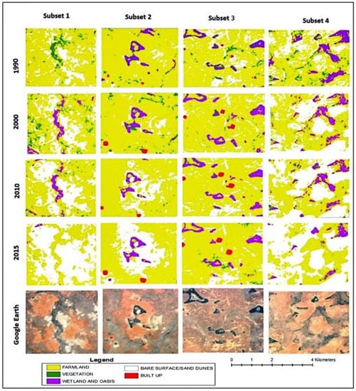 Land cover maps of the study area were produced for all satellite imageries using the conventional supervised classification method and maximum likelihood algorithm [45,46,47,48] and recommended for Sub-Saharan Africa [42]. This method uses sufficient training data to prevent skewed dimensionality, while also enabling the production of relatively fast and robust classification results [49]. Land cover classifications were produced using Erdas Imagine version 9.3. The land cover classes mapped for the study area include wetland and oasis, farmland, built-up, bare land/sand dunes, and vegetation. Our class “vegetation” captures leafy and thorny shrubs, tall grasses, orchards, natural trees and plantations, while the “farmland” class includes irrigated and rainfed agricultural activities; both are small scale, intensive and extensive cultivations. The 2010 land cover map (produced from NigeriaSat-2 satellite imagery) was validated using sample points generated from high-resolution data (Google Earth). A total of 170 sample points were extracted across all five classes to perform the accuracy assessment and an accuracy of 89% was achieved. For the 2015 land cover map, we conducted fieldwork in the year 2016 for this validation using the good practice methods proposed by Olofsson et al. [50]. A total of 308 points were collected from the field and the distributions of the random samples are shown in Table 1. An accuracy of 81% was achieved for the 2015 land cover map (See Table 1). We assumed that the earlier land cover maps (1990 and 2000) had levels of accuracy close to the last two (2010 and 2015) because the same methods and algorithms were used to produce them.