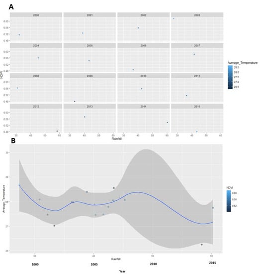 The trajectory of NDVI, rainfall and temperature in the study area ((A) annual distributions mean NDVI, rainfall and temperature. (B) Trajectory of the relationship between rainfall, temperature and NDVI patterns from 2000 to 2015). (A) is presenting the annual distributions and changes of mean NDVI values (Y-axis), the distribution of temperature is presented in graduating shades of the blue (see legend for values for the interpretation of temperature values) and the mean of rainfall received in the region is described in the direction and positions of the dots in the X-axis. (B) is showing the relationship between annual mean NDVI, temperature and rainfall (mean depicted in blue line). The mean temperature is presented on the Y-axis, the mean of rainfall received in the region is described in the direction and positions of the doted blues on the X-axis and the mean NDVI here is presented in graduating shades of the blue dots (see legend for the interpretation of the dotted blue representing NDVI values). The grey curve in the chart describes the correlation or relationship of the three variables. A narrow curve shows a close relationship between weather variables and NDVI, while a wide grey shading reveals a deviation in relationships (especially around 2007–2008).