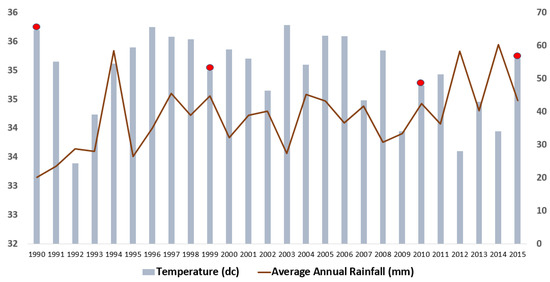 Average annual rainfall amounts and mean temperature over the study area (circled red are corresponding years analysed with remote sensing data). Data Source: Nigerian Meteorological Agency (NIMET).