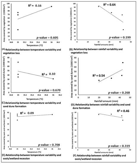 A statistical analysis of climate change and desertification indicators (using simple linear regression modelling) also suggests that over the study period (1990–2015), there was a weak or no relationship or association between climate change indicators and desertification indicators (namely declining vegetation, increasing sand dune formation and receding oasis and wetlands) (Figure 9A–E). Likewise, non-significant p-values are recorded, indicating lacking association across all climate change and desertification indicators in the Yunusari and Yusufari regions of Yobe State. The decrease in mean annual temperature had weak or no relationships with desertification trends represented by land cover/land use indicators, such as decreasing vegetation cover, intensified sand dune development and shrinking oasis and wetlands (Figure 9A,C,E). Results from this study also suggest that there is a weak or no relationship between an increase in the average annual rainfall amount and shrinking oasis and wetlands (Figure 9F). Although there is a strong positive relation between rainfall and all desertification indicators, this relationship, however, is negative, reflecting a decrease in wetland/oasis while rainfall increased, likewise vegetation. Likewise, an increase in rainfall did not translate to a decrease in sand dunes and bare lands.