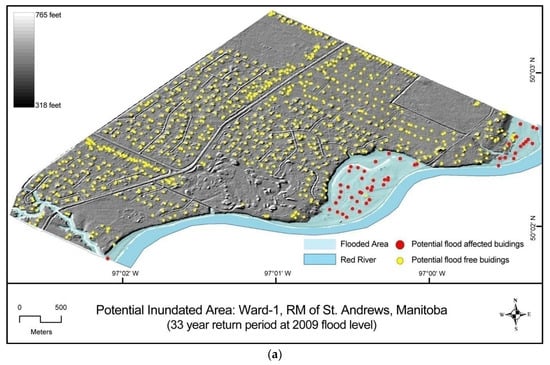 An inventory layer was provided by the RM and Figure 11a,b represents the inundation area affected buildings predicted by the two flood regimes. The red dots in these figures represent the location of the potentially affected buildings, and the yellow dots represent potentially unaffected buildings at the two different stated levels of flooding. Ward-1 has a dike along the Red River with an average height of 730 feet from the mean sea level. The local government also built community dikes in other areas of the RM. These neighborhood and individual dikes were also built at an average height of 730 feet from the mean sea level. For Ward-1, a water level below 730 feet would not affect the community people in a noticeable way. However, in 2009 the flood water rose at an average of 750 feet from mean sea level and thereby created massive destruction.