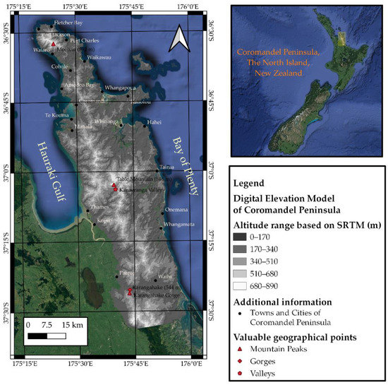 The geomorphology of the studied area is variable based on the elevation model of the Coromandel Peninsula [30]. The landscape of the south is mostly formed by mountain ranges with elevations between 700 and 900 m, mostly rising to the southwest from Karangahake Gorge (Figure 1). The relief is formed by remnants of the Waihi Caldera, with the area becoming flatter closer to sea level as one moves north. A long mountainous ridge at the center of the region commences at the Wharekawa Caldera (near to the settlement of Whangamata) and extends to Colville in the far north, where elevation once more decreases closer to sea level. Moving west to east, a rise in elevation commences in the west, with the highest central point found at Upper Kauaeranga in the central region (Figure 1). Further east landscape features are formed by remnants of the Kapowai Caldera and the Whitianga Volcanic Center. The north part of the peninsula is mostly formed by rolling hills with lower elevations between 180 and 540 m above sea level. However, at Waiaro, elevation rapidly starts to rise from 180 to nearly 900 m, with the highest point being Mount Moehau at 892 m. In conclusion, the territory of the Coromandel Peninsula contains many uneven surfaces with rapid changes in elevation ranging from sea level to 900 m and above, resulting in a high diversity suitable for testing for geomorphological assessment.