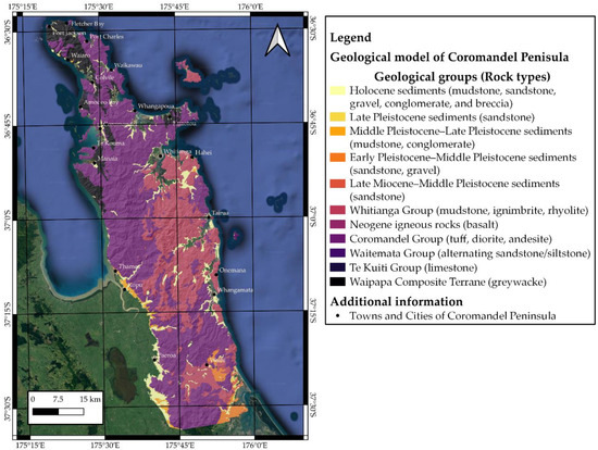 Geological model of Coromandel Peninsula based on the 1:250,000 scale New Zealand Geological Map (Q-Map Series—https://www.gns.cri.nz/data-and-resources/geological-map-of-new-zealand/, accessed on 20 August 2022) [36]; background is Google terrain map.