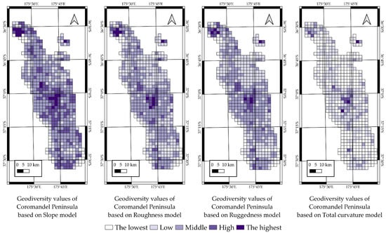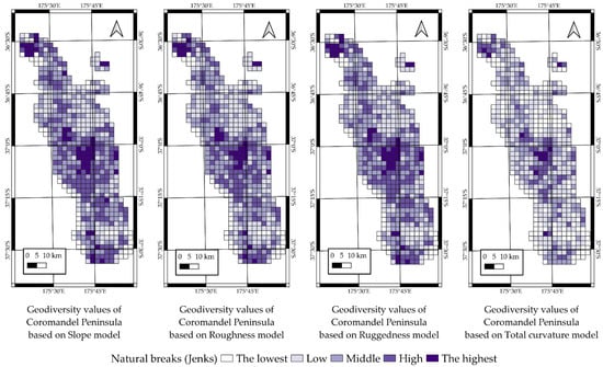 Additionally, we applied natural breaks (Jenks) mode for comparison of results of the same models. This mode was considered as its divides the models’ data based on common patterns. The slope model mostly defines the same areas, as we saw when applying the equal interval mode; however, clusters with high values are much wider, and more areas show the highest value for geodiversity (Figure 4). Clusters became more connected to each other when covering a large area of research with high values; however, significant locations are still found in the same areas with higher geodiversity values compared to equal interval mode. In this case, we see more convergence towards the slope (natural breaks) model. In locations with the highest values in the central region of Coromandel Peninsula, we see differing values for ruggedness and roughness. Total curvature trends towards higher diversity compared to equal interval mode but still displays low values for geodiversity, especially in the central–east and southern regions of our study area.