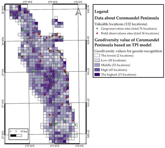To demonstrate the accuracy of our qualitative–quantitative assessments of geodiversity more objectively, we utilized data from field observations carried out in the Coromandel Peninsula as well as sites extracted from the New Zealand Geopreservation Inventory (http://www.geomarine.org.nz/NZGI/, accessed on 28 August 2022 and https://naturemaps.nz/maps/#/viewer/openlayers/484, accessed on 28 August 2022) to check alignment between high and the highest values. To achieve this, all points of observation were overlapped on each model, utilizing natural breaks mode for evaluation (Table 5 and Table 6). However, not all these points should be considered as geosites as our field observations were based on checking the whole Coromandel Peninsula. Some points we observed may only be notable for views of offshore islands or distant mountains. In contrast, New Zealand Geopreservation Inventory research contains more points based only on specific geological or geomorphological information. Therefore, as shown in the table of our field observations, 56 locations were captured by our assessment, where slope model captures 8 locations of the highest values, then 6 locations are captured by ruggedness, and 4 locations by TPI. However, this model also has 23 locations as high values, while slope and ruggedness captured only 10 and 11, respectively (Table 5). Data about scenic points downloaded from New Zealand Geopreservation Inventory contain 76 locations of interest. All of them have been included in our assessment, giving similar results to data from field observations, or rather pattern (Table 6). Once more, slope and ruggedness captured 12 and 11, respectively, for the highest value. Meanwhile TPI has 11 for the highest and 22 for high values, which is higher than slope, roughness, and ruggedness, which captured 2 for each. Both tables demonstrate that the total curvature model is unfit for this assessment as most points falling into places with middle and low values. Additionally, Geomorphon is also demonstrated as being unsuitable for our purposes due to homogeneous results, as described in the Results section, despite capturing a high number of locations. We have visualized our results in Figure 7, where geosite recognition based on TPI is presented with our field observation points and New Zealand Geopreservation Inventory sites.