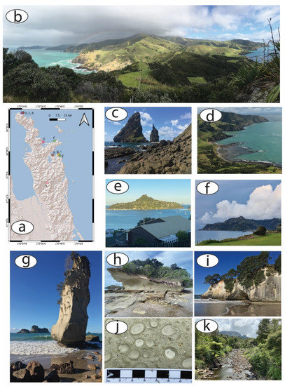 - Adams, C.; Graham, I.; Seward, D.; Skinner, D.; Adams, C.; Skinner, D.; Moore, P. Geochronological and geochemical evolution of late Cenozoic volcanism in the Coromandel Peninsula, New Zealand. N. Z. J. Geol. Geophys. 1994, 37, 359–379. [Google Scholar] [CrossRef]