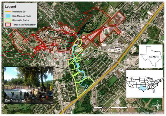 San Marcos River (SMR) social–ecological system (SES) study area, located in central Texas, USA. The river flows from the university campus at top of map south through the City of San Marcos riverside parks. Inset photo shows one of these parks (Rio Vista Park) on a typical summer day.