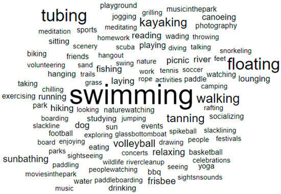 Activities reported by river users, where size of word is proportional to frequency. Verbs with multiple tenses were changed to the same tense. Categorical data are reported in Appendix C. Word cloud was generated using Word it Out, a product of Enideo.
