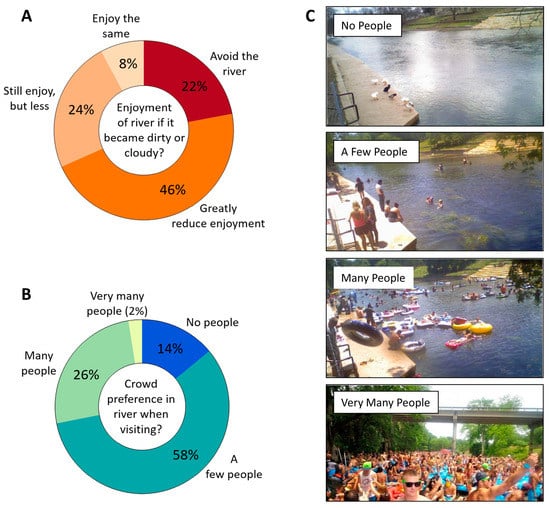 Preferences of river use by social actors based on water quality (A) and crowding preference (B). The images on the right (C) were included in the survey as a reference for crowd preference. The top three images are from City Park in San Marcos. Note in the second image the Texas wild rice present in the river and the exceptional water clarity when there are not “very many people” in the river. The bottom image was taken farther downstream near a commercial tubing operation.