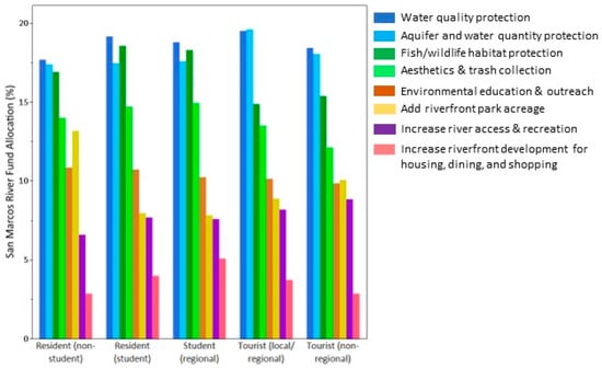 The final method we used to measure environmental values was asking participants to distribute money (percentage-wise, totaling 100%) from a hypothetical annual fund dedicated to improving the San Marcos River. The funding distributions were relatively consistent across all user groups (Figure 4), with water quality protection, water quantity protection, and habitat protection being the top three funding priorities. Riverfront development for housing, dining, and shopping was by far the least important—less than 5% for all user groups. However, there were some notable differences among user groups. Students (both resident and non-resident) placed greater importance on habitat protection for fish and wildlife. Non-student residents placed relatively high importance on increasing riverfront park acreage. Regional tourists placed the greatest importance on protection of water quality and water quantity, almost equally.