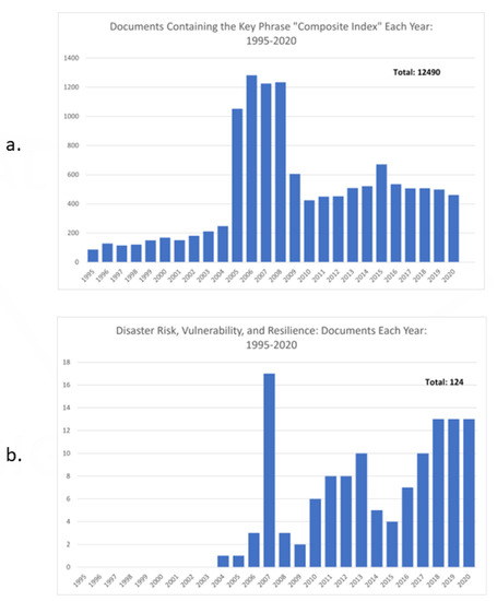 (a) (top) shows the number of documents, each year, in which the key phrase “composite index” appears. (b) is the number of documents each year containing one or more of the following key phrases: “disaster risk index”, “disaster vulnerability index”, “disaster resilience index”, “community risk index”, “community vulnerability index”, “community resilience index”. The charts were produced using the results of ITHAKA’s Constellate service at https://constellate.org/builder, and presented here under their terms and conditions of permitted use, accessed 10 August 2023.