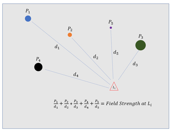 The idea of interacting spatial fields yields another result. The effect or “field strength” of phenomena at any location is the sum of all the spatial interactions. Figure 3 shows five instances of the same phenomenon, each at a different distance from a location of interest. The total effect at this location is the sum of their contributions.