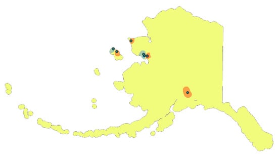 We applied the same eight steps to 30 military facilities in Alaska (Figure 9) to demonstrate versatility and how this spatial approach can be applied to fully non-observed locations. The surface was once again applied, but the spatial relationships of the infrastructure were recalculated into a based on their distances to the military facilities (Figure 8).