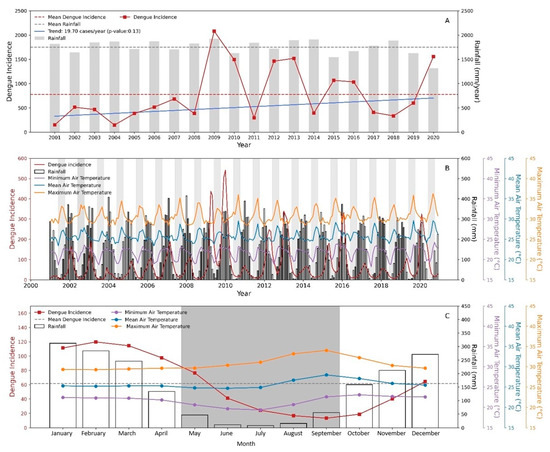 Total rainfall and annual dengue incidence with Mann and Kendall trend (A); monthly dengue incidence, monthly rainfall, and monthly minimum, mean and maximum air temperatures (B); and monthly mean of dengue incidence, monthly rainfall, and monthly minimum, mean, and maximum air temperatures (C) in Mato Grosso from 2001 to 2020. Gray area represents the dry season in Mato Grosso.