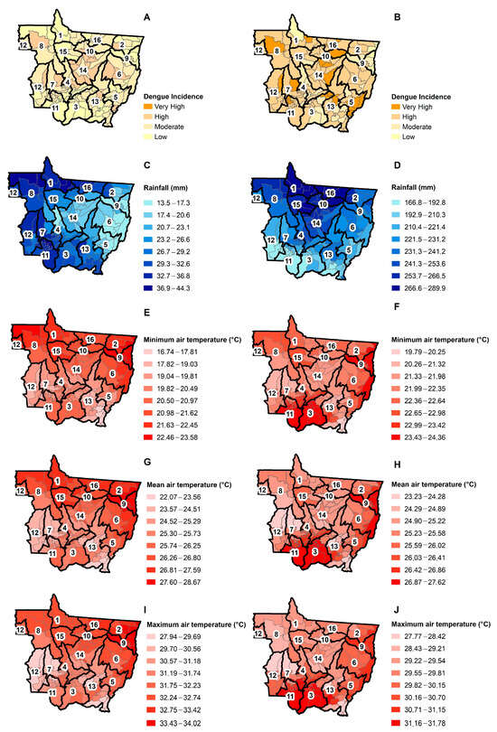 Classification of dengue incidence in the dry (A) and wet (B) seasons; mean seasonal rainfall in the dry (C) and wet (D) seasons; the minimum air temperatures in the dry (E) and wet (F) seasons; the mean air temperatures in the dry (G) and wet (H) seasons; and the maximum air temperatures in the dry (I) and wet (J) seasons in the municipalities of Mato Grosso from 2001 to 2020.