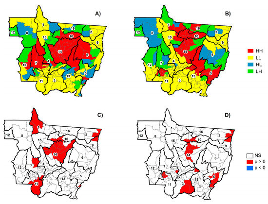 Moran scatter diagram during the dry (A) and wet (B) seasons and Local Moran Index during the dry (C) and wet (D) seasons in the municipalities of Mato Grosso from 2001 to 2020. HH = high-high (red); LL = low-low (yellow); HL = high-low (blue); and LH = low-high (green). NS = no correlation; ρ > 0 = positive correlation; and ρ < 0 = negative correlation.