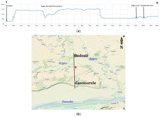(a). N–S topography profile across the Argeş Promontory (built on [92]) (modified from [11,93]) (b). Location of the topography profile. Red rhomb marks the position of the observed Crivăt Fault outcrop.