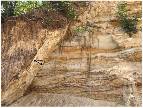 The NNE–SSW-trending fault, characterized as a normal fault, is separating a downlifted SSE compartment of outcropping Quaternary loess and soil deposits, from an uplifted NNW compartment of outcropping cross-bedded Upper Pliocene sediments, represented by sand deposits of probably Romanian geological age [11,63,93]. The tectonic feature is a sand-filled fault, ca. 100 cm wide (Figure 8). Its apparent dipping angle varies from 60° ESE to 68° ESE.