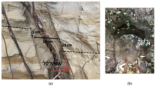 Observations on the Crivăţ Fault outcrop, 2022 field works: (a)—two E–W parallel normal faults, cutting the Romanian sands; (b)—spring emergences observed in the Crivăţ Fault outcrop area.