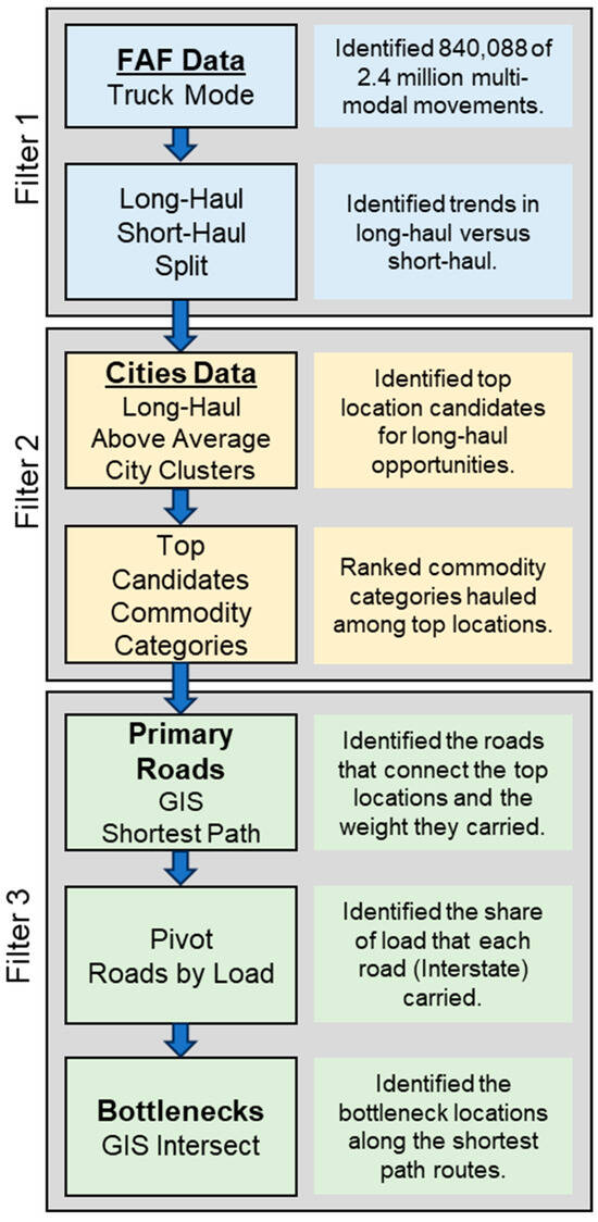 Figure 1 provides an overview of the research methodology with an illustration of the combined data mining and GIS workflow. The procedures shown are either Python code or GIS algorithms that filter the flow of data in three stages. The first filter stage involves extracting truck movements from the multimodal FAF dataset and dividing the OD flows into LH and SH movements. The FAF categorizes each OD flow within one of eight distance bands: {<100, 100–249, 250–499, 500–749, 750–999, 1000–1499, 1500–2000, >2000} miles. Distances below 250 miles signify that a round trip would be, at most, 500 miles. Therefore, the total round trip drive time at an average speed of 60 mph will be 8.3 h. Considering that U.S. hours-of-service (HOS) regulations limit driving to a maximum of 11 h after 10 consecutive hours off duty [44], a round trip of 500 miles leaves 2.7 h of margin for potential delays due to congestion and other activities such as load management, refueling, and documentation. A threshold of 250 miles is also consistent with the recharge capability of a typical fast charger for electrified trucks [45]. The U.S. DOT specifies long-haul, short-haul, and regional trucking as the three market segments in trucking in their report to Congress on automation in long-haul trucking [46]. The report defined long-haul trucking as distances where the driver is usually away from home, usually considered greater than 250 miles [47]. Hence, selecting 250 miles as the threshold to separate SH and LH truck movements was a justifiable scenario while maintaining consistency with the FAF distance bands.