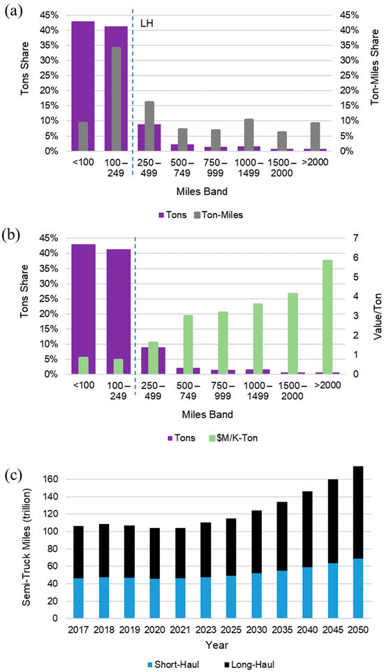 Statistical analysis (a) STL and STM share by miles band, (b) value per ton, and (c) STM by forecast year.