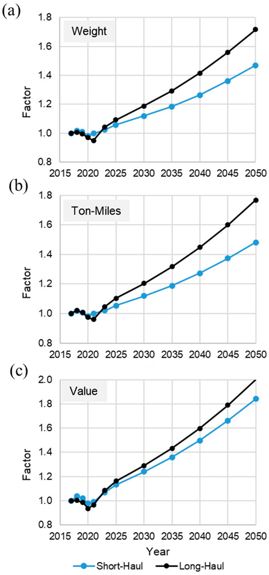 SH and LH factor increase from 2017 of (a) weight, (b) ton-miles, and (c) value.