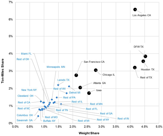 The scatter plot emphasizes FAF zones which processed a weight of LH movements that was above the average value transported among all FAF zones. The average value excluded movements within a FAF zone. The top cluster selected, represented by circle-shaped markers to clearly visualize the separation, comprised eight FAF zones within five states. These zones contributed 27% of the LH weight processed by all FAF zones. The top eight FAF zones were within the states of California (Los Angeles, San Francisco), Texas (Dallas Fort Worth or DFW, Houston, the rest of Texas), Illinois (Chicago), Georgia (Atlanta), and Iowa. Carriers can later expand this first stage of AT deployments by targeting routes that connect the remaining regions (diamond shaped markers) in the lower left quadrant.