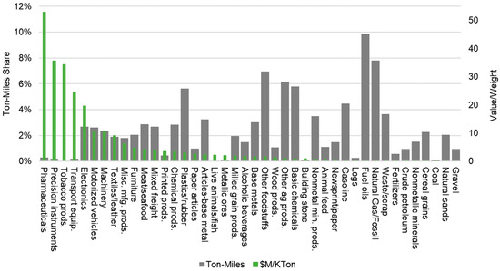 Ton-mile and weight share of commodity categories.