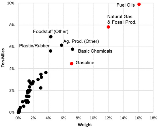 Interestingly, the fossil fuel-related categories, including “fuel oils”, “natural gas and fossil products”, and “gasoline”, were among the most prolific in terms of ton-mile production and weight moved by trucks. Those three categories accounted for more than 22% of the ton-mile production and more than 35% of the weight moved but were among the lowest value per unit weight. This suggests that fossil fuel production leads to significant truck traffic and road stress, two external costs not frequently addressed in the literature. However, if there is a strong shift towards renewable energy production and a lowering of demand for fossil fuels, that might reduce the number of trucks carrying fossil-fuel-related products.