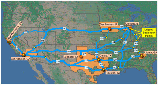 The GIS spatial intersection technique identified the top bottleneck locations along those shortest paths that connect the selected FAF zones [48]. According to ATRI, the average peak hour truck speed was 36.3 mph in 2023, which offers further insight into the impacts and importance as a factor in the decision-making process to target AT deployments.