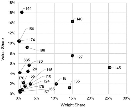 The line thickness in the map (Figure 7) is proportional to the weight share that an Interstate route supported. Figure 8 visualizes the weight and value share that the Interstate highways supported. The figure presents a visualization showing that the highways I40, I45, and I27 are clear outliers in both weight and value share. From Figure 7, it becomes evident that these highways connect large port cities or freight hubs like Houston in the south, Los Angeles in the west, and Atlanta in the east. Interstate I35 provides a connection between the major highways that intersect in Dallas and those that intersect in Oklahoma, providing alternate routes that connect the eastern and western regions of the United States.