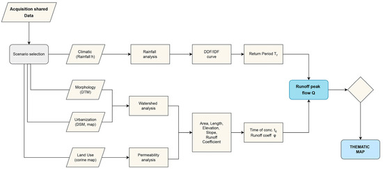 In particular, the analysis, once the return period of the reference rainfall event is established, allows for comparing different urban situations within the same area, associating with each of them a synthetic assessment of the peak flow in the closing section of the watershed to which the area belongs. The considered urban situations may represent, as in the examined case study, different scenarios from the past or planned situations not yet implemented. In all cases, the comparison allows the evaluation of the urban solution that determines the least hydromorphic impact, which corresponds to the lowest peak runoff. Furthermore, by varying the considered Tr, the strength of the event used in the analysis may change.