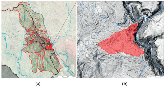 By applying the methodology described, the DTM map of the city of Matera was examined through the Q-GIS 3.4.13/GRASS7.2.0 software [54,55], allowing us to identify 21 independent urban catchments (Figure 2a) including the Sasso Caveoso watershed (Figure 2b), whose urban changes over the last 140 years have been meticulously described and analyzed using the proposed hydromorphic approach.