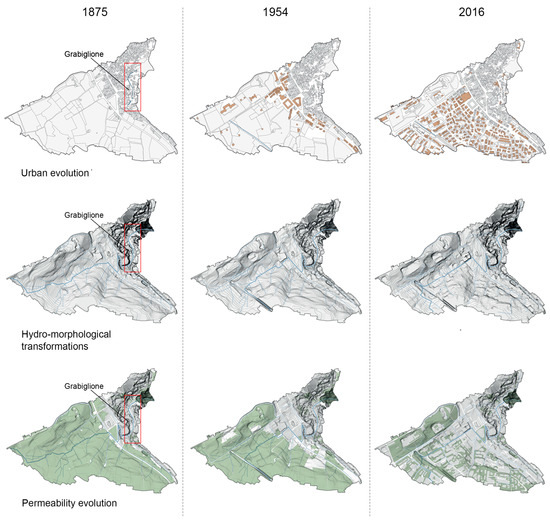 Sasso Caveoso watershed in the 1875, 1954 and 2016 scenarios: Urban evolution (in gray the Sasso Caveoso district, in brown the new urbanizations), morphological transformation (main runoff pathways—blue line), permeability changes (impervious area in gray, pervious in green).