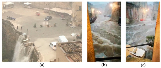In particular, it was noted (Table 3) that the city of Matera is often affected by short but intense precipitation, with values of maximum 1 h precipitation depths exceeding 30 mm, although with low return periods (Tr < 5 years). In such situations, severe criticalities are observed with widespread flooding and significant surface runoff (Figure 4) in multiple areas of the city, especially in the Sasso Caveoso.