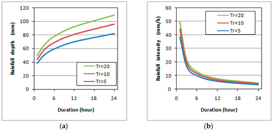 - The rainfall analysis, which considers the recorded rainfall data and applies the usual statistical methods for rainfall analysis [57] to estimate the DDF curve (Equation (3)) and the IDF curve (Equation (4)) for different return period Trwhere:
