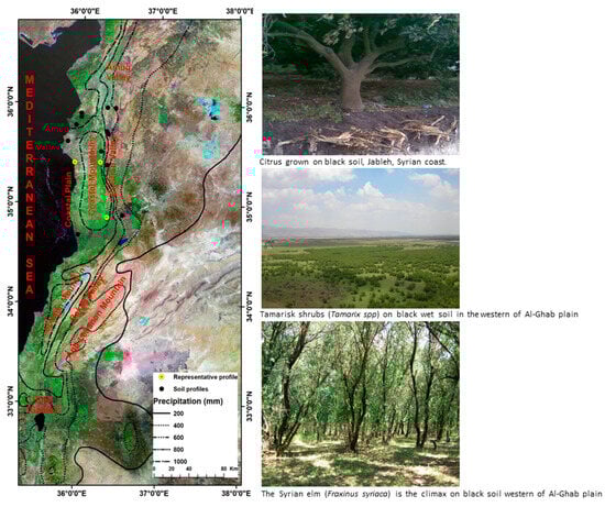 First, areas expected to contain black soil based on previous research results [33,41] were investigated. Subsequently, 15 soil profiles in Syria, known for harboring the largest share of black soil in the region, were studied. The soil profiles were selected to represent the diverse environmental and topographic conditions of the eastern Mediterranean region; see Figure 1.