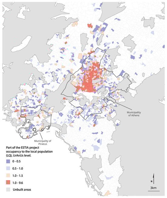 Figure 4 shows the distribution of URANUs according to the presence of ESTIA beneficiaries. Using a location quotient (LQ), we mapped their share to the permanent population (2011) in a given URANU, comparing it to their share in the study area. A LQ score of 1.00 indicates a presence similar to the average profile (1% of the permanent residents). The darker the colour, the greater the distance to the average with red nuances indicating over-representation and blue under-representation. The analysis reveals a stronger presence of ESTIA beneficiaries in the central parts of the city as well as in the adjacent municipalities of the western part of the metropolitan area. Many units of lower presence are also found in the western more remote low-rise parts of the city centre.