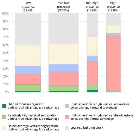 Figure 5 illustrates the spatial relationship between the data depicted in Figure 3 and Figure 4. The columns show how the groups of URANUs according to the presence of ESTIA-accommodated migrants (Figure 3) are distributed to different areas of vertical segregation (across the typology of EVS). Furthermore, the width of each column indicates the size of each group. We observe first that the higher the presence of migrants, the lower the possibility of a unit being found in areas non-susceptible to vertical segregation (in grey). The same goes for their presence in zones of limited vertical segregation (in yellow). Furthermore, their presence appears to have limited association with the areas of high and relatively high vertical segregation (in green) or of vertical advantage. This finding suggests a strong relationship between the presence of migrants and vertical disadvantage. In fact, 71.1% of URANUs of a higher over-representation of ESTIA beneficiaries are also areas of vertical disadvantage.