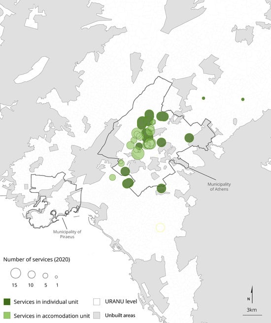 The concentration of services In proximity to central accommodation locations where the majority of migrants were accommodated was intending to address the challenges, reported in local studies, and especially the dehumanising conditions in camps [66,67,68,69] to enable access to integrated interventions and to improve coordination between civil and local government agencies. Our informants also emphasised why central locations facilitated intermediation to access specialised health services, which was important for vulnerable individuals and families, to address discrimination by housing landlords, and to enhance interaction with school and local communities. According to our informants, the provision of services in central locations led to an increase in the everyday mobility of migrants and visits to services, regardless of their place of residence, and this has also been reported in local studies [37]. This has in part compensated for the limited provision of services available in the port of Piraeus and in western suburban areas (Figure 6). In due course, apart from the initial providers, many other smaller charities and solidarity organizations, from below, were attracted, gradually increasing the density and the expansion of the services network to adjacent areas.
