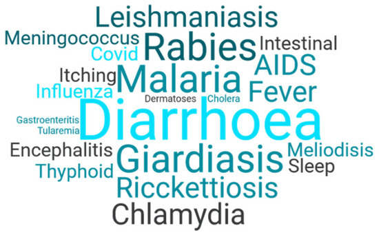 The most common category of references explores the relationship between backpackers and health, often framing backpackers as a population at risk. This question appears in many studies on the incidence of diseases affecting tourists. The word cloud shown here (Figure 1) reflects the frequency of references related to various diseases. The most frequently mentioned (13 times) is traveller’s diarrhoea (turista), but there are also numerous studies on parasitic infections (6), malaria (5), sexually transmitted infections (STIs) (4), rabies, and hepatitis (3).