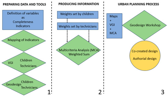 Once the children and one of their parents signed the ethics forms, the data generation stage began. The fieldwork activities involved several methods. The data gathered through different methods integrate and complement each other. The process is based on a framework that involves volunteered mapping (VGI), the characterization of the study area by integrating variables (multicriteria analysis), and building ideas for the transformation of the area through a cocreation process (geodesign).