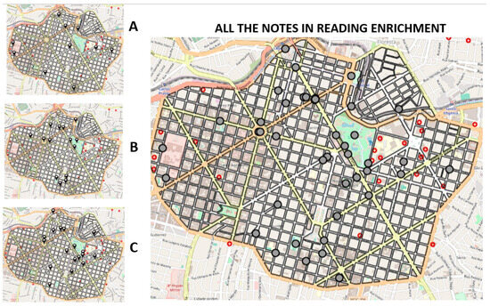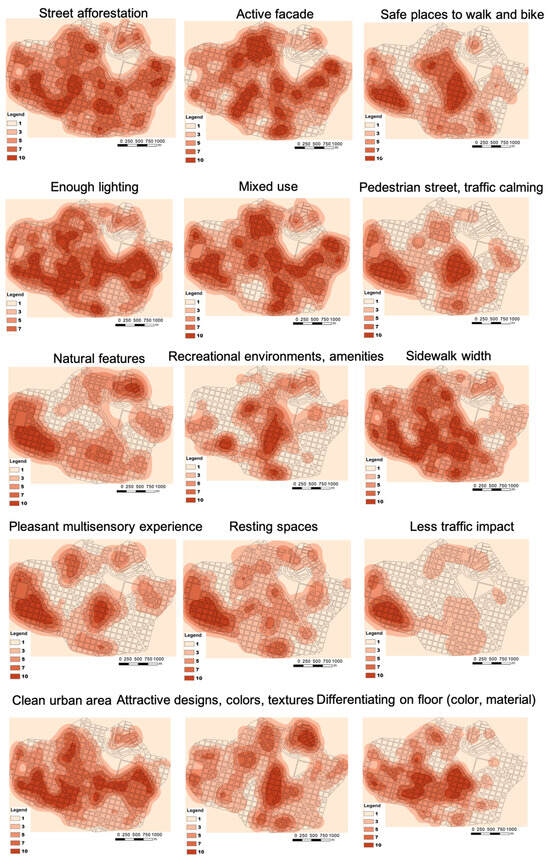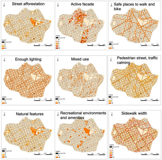 The technical group of undergraduate urban planning students mapped 13 of the 15 indicators using ArcGIS geoprocessing applications (Figure 3). In each map, scores were assigned to the components of the legend, indicating their importance for children’s independent mobility. Later, the maps were used individually as a basis for proposing ideas for the area, and they were also combined by the weighted sum according to their degree of importance in children’s mobility.