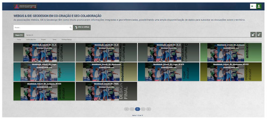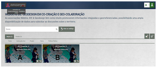 Geodesign is a process that favors the shared construction of ideas for an area through a cocreation, negotiation, and decision process. For this step, the web-based GISColab platform was used, developed by GE21 Geotecnologias and adapted to the geodesign by Moura and Freitas [39]. The platform is structured as a spatial data infrastructure (SDI) in which the collection of preprepared maps is made available to workshop participants to inform themselves about the area’s characteristics, vulnerabilities, and potentialities.