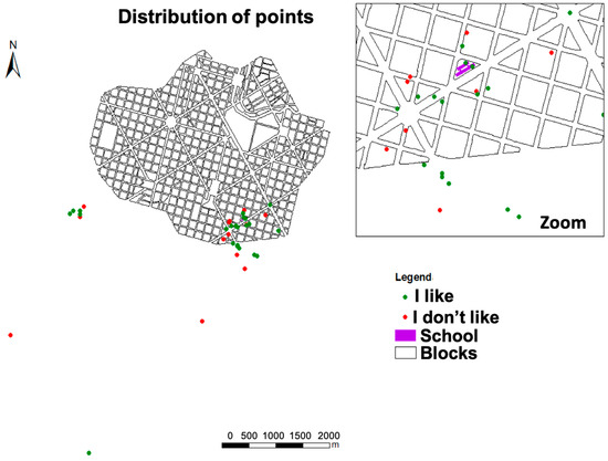 The registration of “like” and “dislike”, followed by descriptions, aimed to identify the most attractive and least attractive urban features for the children, following Tuan’s principles of topophilia (like) and topophobia (dislike) [36,37]. The principle is also supported by Lynch [38], who wrote that a qualified space that generates connections between citizen and territory generates sensations and security that favor the sociocultural development of the individual, which also lends support to participatory planning.