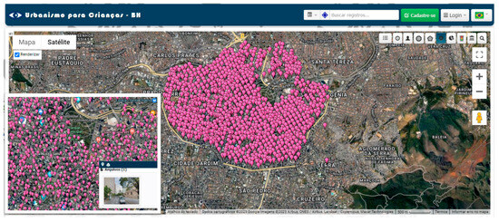 Data were captured by voluntary mapping, by the VGI application, both with children and with a technical approach. When working with the children, the initial expectation was that they could carry out fieldwork with the VGI application on their cell phones. The technical team and their parents could eventually help, while they would register “like” or “don’t like” opinions in loco, resulting in a mapping of topophilia and topophobia [36,37]. However, the authorizations and restrictions to withdraw a child from school were complex, so they worked from their memories of perception and cognition [38,45].