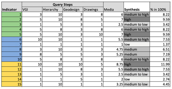 Finally, to integrate the children’s opinions, tables were built containing the relative value assigned to each indicator at each consultation stage: in the VGI, in the consultation on the hierarchy of indicators, in the geodesign, and in the drawings of the artistic workshop (Figure 15). Multicriteria analyses by the weighted sum were constructed for each stage of the investigation, and a synthesis integration of the partial results was performed.