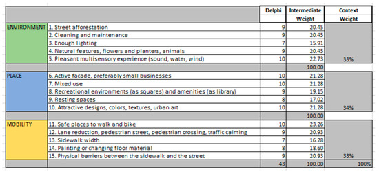 In the technical work, a Delphi query was applied, requesting the importance, on a scale from 0 to 10, for each variable. From the first answer, the average and mode of the values were calculated, so that, in a second round of consultation, each technician compared their opinion with the average values obtained and could adjust. Finally, the average of the last round was calculated, and the relative importance values of each variable were calculated, adding up to 100%. As a result, the weights for the indicators were defined according to the degree of importance for the mobility and permanence of children in urban environments (Figure 16). Multicriteria analyses by the weighted sum were constructed for the research axes of environment, place, and mobility, as well as an integration synthesis of the three approaches.