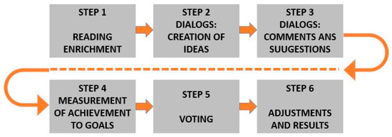 In the technical group, they were divided into three groups to carry out the reading enrichment stage. Next, they would create ideas for the context’s “environment”, “place”, and “mobility”, associating each idea with one or more of the fifteen completeness indicators. The ideas would go through discussions and comments, the achievement of goals would be verified to meet the 15 indicators, and, finally, they would vote and decide on the final proposal (Figure 7 and Figure 8).